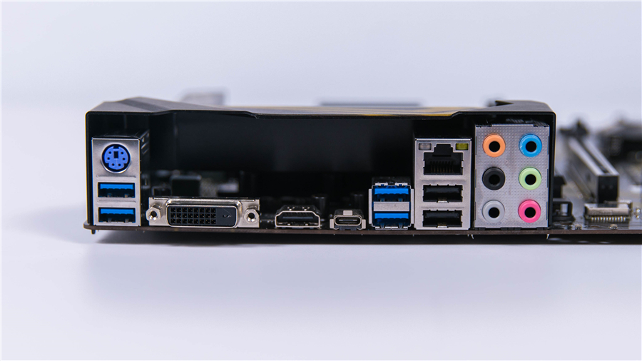 主板I/O接口方面,從左往右依次為USB3.0 x2,DVI-D,HDMI,USB3.1 Gen1 Type C x1,USB3.1 Gen2 x2,USB2.0 x2,其他不做贅述。雖然因為設計原因看起來有些“空”,但也非常的齊全。