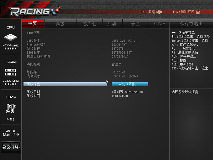 主界面可以設置系統語言和時間。映泰Z370GT6的BIOS自帶中英文及其他語言。