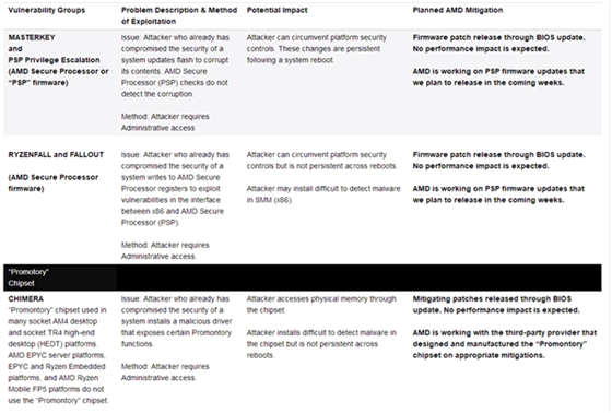 AMD初步將漏洞劃分為三類:“Masterkey”、“RyzenFall/Fallout”、 “Chimera”。前兩者只涉及芯片本身,通過BIOS更新可以完全免疫,未來幾周內就會放出更新;后者關于芯片組,也可通過BIOS更新解決,AMD正和華碩的子公司祥碩加緊合作研發。