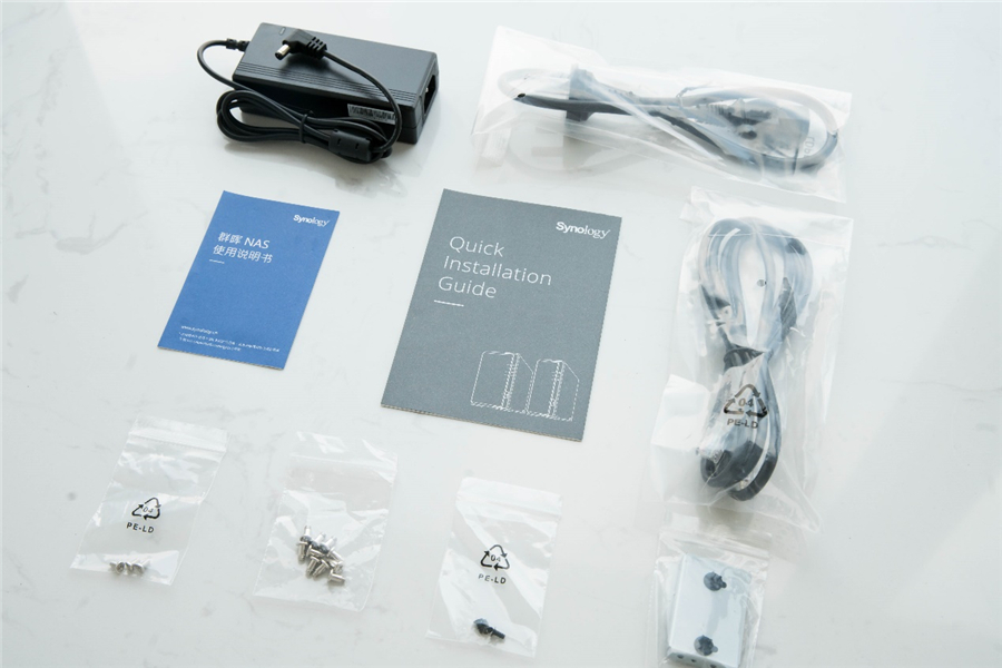 在配件方面,群暉配置了電源適配器,電源線,網(wǎng)線,以及四包小零件。
