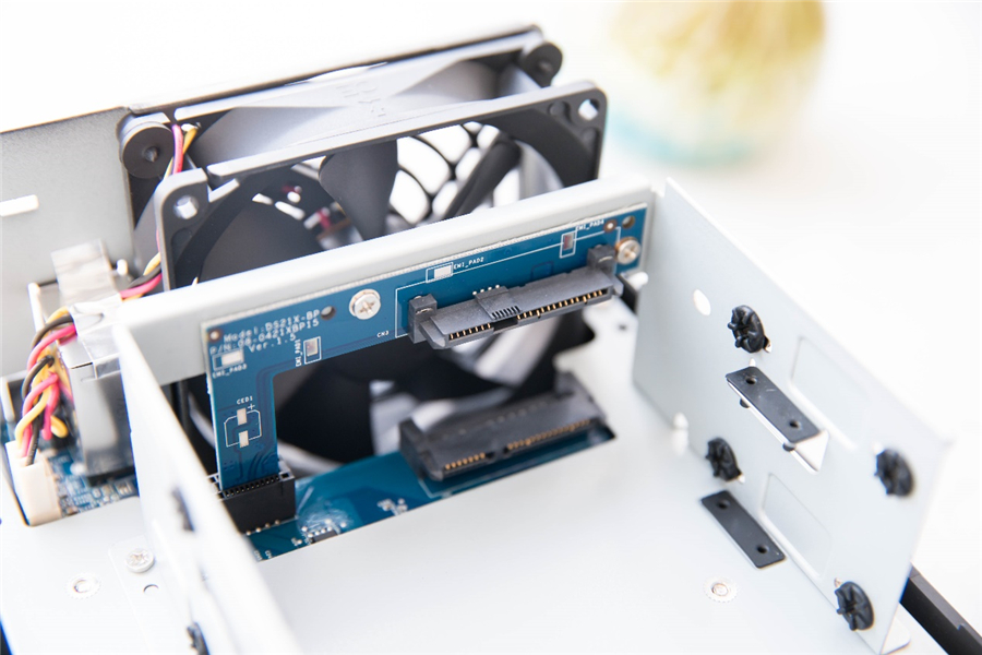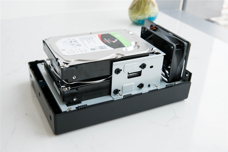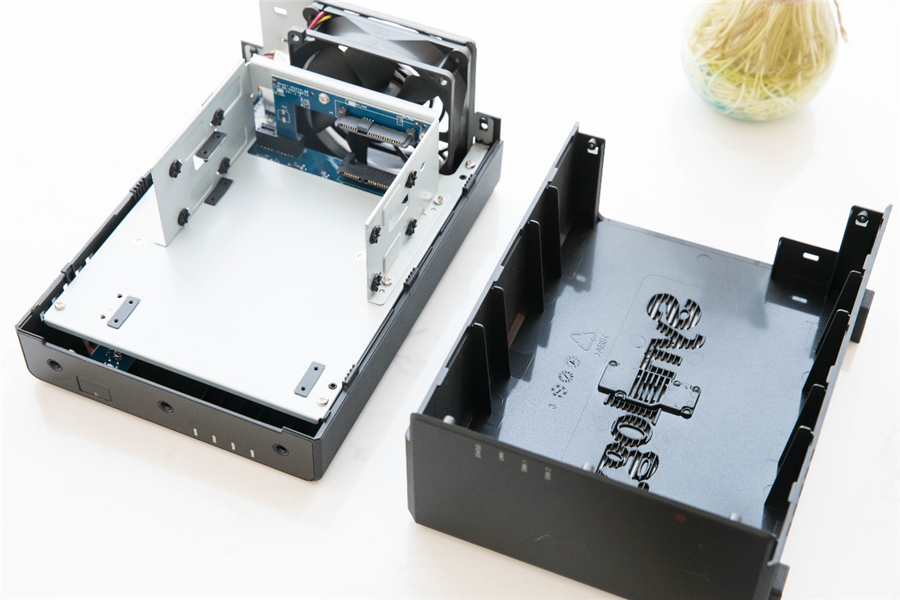打開后可以看到內(nèi)部做工精良,群暉在里面放置支持熱插拔的雙端口硬盤架。