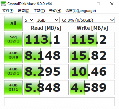 通過(guò)CrystalDiskMark得出NAS的寫入速度為115MB/s,讀取速度為113MB/s。