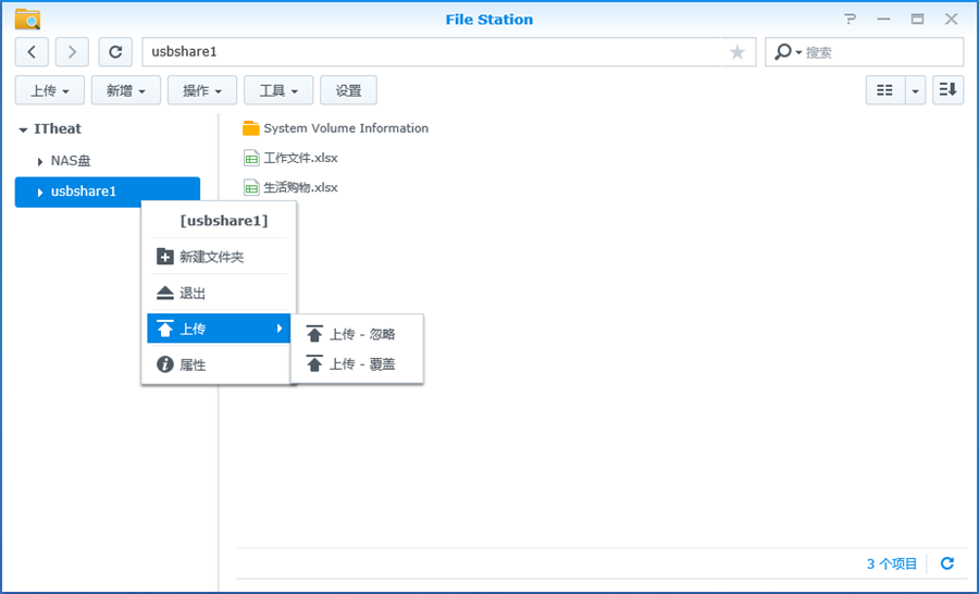 我們可以使用移動(dòng)硬盤直接插在NAS背后,用電腦登陸DSM操作系統(tǒng)后,可以直接對(duì)移動(dòng)硬盤進(jìn)行操作,比如上傳整個(gè)移動(dòng)硬盤的資料,你可以選擇“上傳—忽略”來(lái)使整個(gè)上傳為增量備份,所有重復(fù)文件不會(huì)再次復(fù)制,更加提升效率。