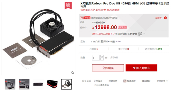 在顯卡領域,AMD的金字招牌就是性價比超高,相比隔壁家英偉達動不動就售價超2萬人民幣的定價,農企顯得良心許多,也更接地氣。而如今,AMD更是把性價比玩到了極致,在國內電商天貓上,訊景的Radeon Pro Duo售價已經出來了:13998元,近1萬4。