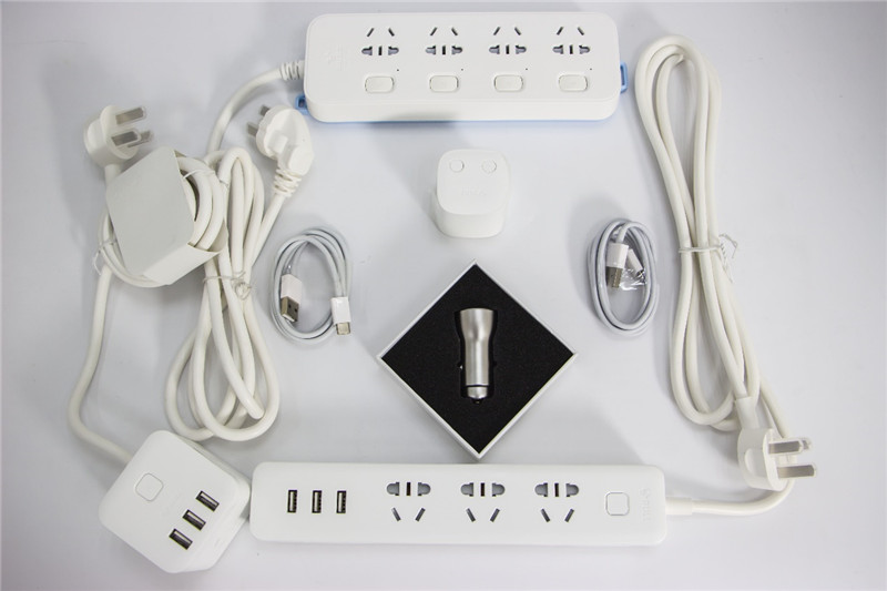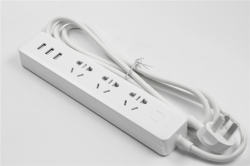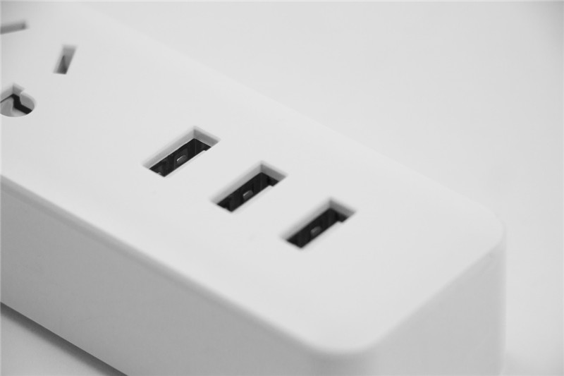 白色包裝的延長線插座帶有3個USB插孔。內置自動充電識別芯片,可為市面上絕大數數碼產品進行5V快充。