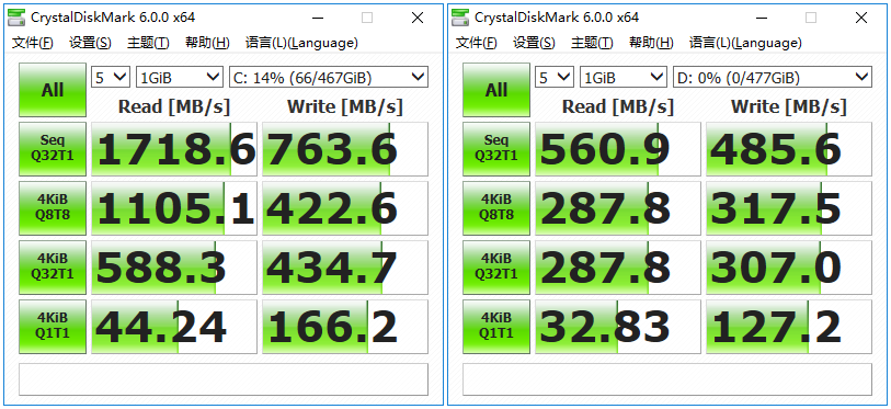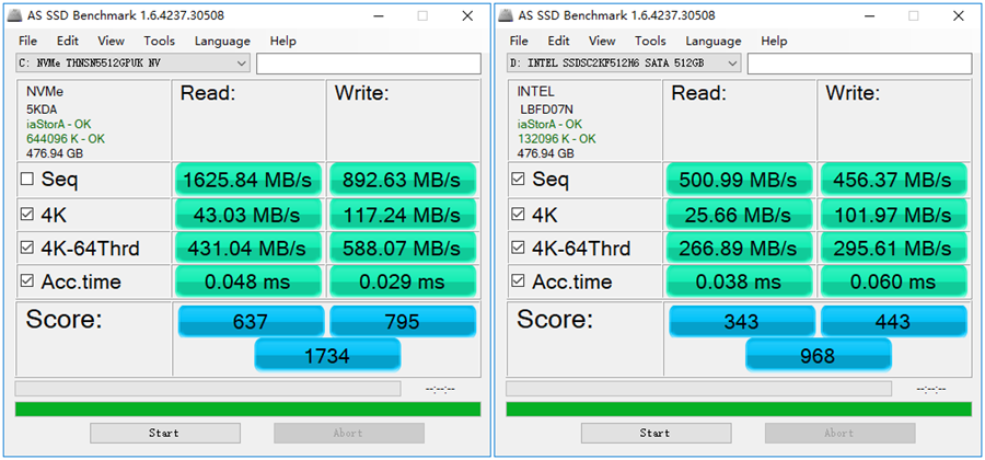 AS SSD Benchmark是常用的硬盤測試軟件,它的測試結果比較接近日常使用速度。在AS SSD的測試中,東芝的NVMe規格M.2 SSD得分1734分,在持續讀寫上非常亮眼;Intel 5400s作為SATA SSD得分968分,讀寫上也跑出了接近理論值的速度。