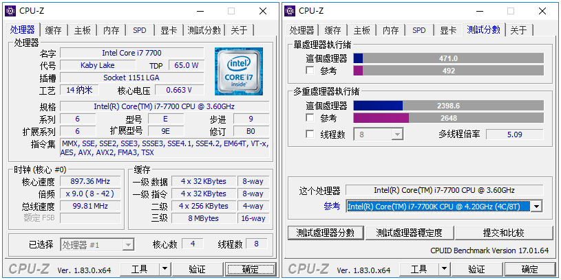 CPU-Z不用多做介紹,最常用的工具軟件之一。測試中,i7-7700單核得分471,多核得分2398.6。與4.2GHz的i7-7700k差距并不大。