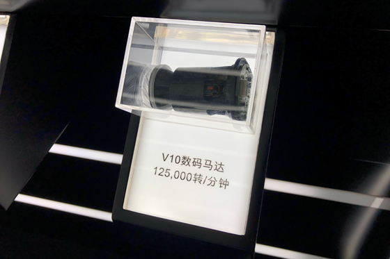 現(xiàn)場(chǎng)放大版的V10數(shù)碼馬達(dá)模型,讓我們看到了不同以往設(shè)計(jì),這也是戴森引以為傲的地方。它采用特制的陶瓷軸承,每分鐘轉(zhuǎn)速高達(dá)125000轉(zhuǎn),重量僅125g(同比V8馬達(dá)每分鐘轉(zhuǎn)速是107000次,重量為220g)。相比傳統(tǒng)的馬達(dá),這款馬達(dá)擁有八個(gè)極,可以進(jìn)行更快切換,能顯著提高性能。
