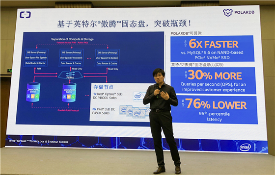 阿里云數據庫業務總經理曹偉先生在會上進行了主題為《POLARDB深度解析:一款云原生的數據庫》的演講,分享了英特爾傲騰固態盤所帶來的技術進步。