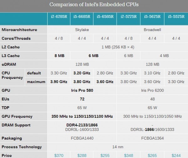 無獨有偶,Intel近日針對嵌入式市場也發布了新的R系列處理器,包括Core i7-6785R、Core i5-6685R、Core i5-6585R三款產品,都配備了Iris Pro 580核顯,擁有72個EU單元和128MB eDRAM。