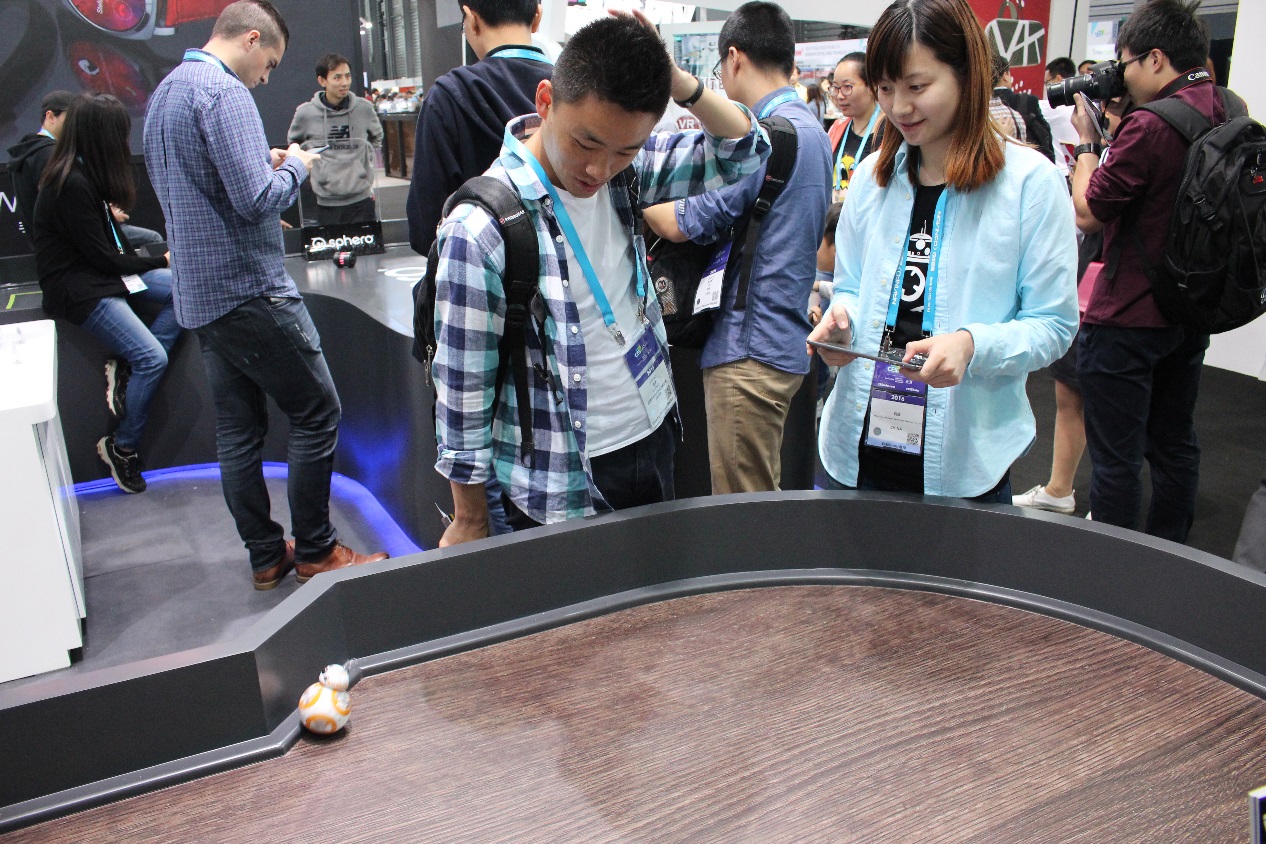 首先看到的就是由Sphero公司打造的BB-8周邊機器人,這個機器人之前在國外已經(jīng)十分火爆,消費者可以通過App發(fā)出指令,甚至像星戰(zhàn)電影中的橋段一樣控制它,這也讓許多星戰(zhàn)迷一發(fā)不可收拾的愛上了它。現(xiàn)在Revo IT Asia把它帶回了中國,再本次展會上終于親眼目睹了這款機器人,確實很好玩,非常可愛,就是目前功能太少,相信以后一定會有改善。