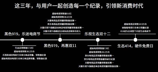 此外,這三年樂視超級電視還創造了一系列行業紀錄。2015年919黑色樂迷節總銷量突破38.2萬臺;2015年雙11總銷量38.6萬臺;2015年雙12總銷量28.2萬臺;2016年414硬件免費日總銷量54.9萬臺。無論是天貓、京東還是整個電視行業,樂視超級電視幾乎壟斷關于電視的一切紀錄,行業霸主地位難以撼動。