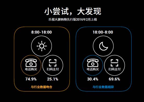 在8點-18點的時段內,樂視超級電視大屏購物通過電話、掃碼支付的行為與行業數據基本吻合,分別為74.9%和25.1%,說明該時段主要購買的人群年齡偏大,但在18點—8點的時段內,通過電話、掃碼支付的比例為30.4%和69.6%,這與行業數據有很大差距,說明該時段的主力購買人群為年輕人。