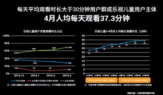據介紹,學前兒童目前是樂視兒童的主力軍,學齡兒童比重隨著生態布局逐步增加;男女比例接近均衡,女孩比男孩更愛看電視;在觀看時間段上,上午與下午是用戶觀看高峰期,家庭主婦與爺爺奶奶是這個時間段主要監護人;觀看時長方面,月度觀看時長趨于穩定在30-35分鐘,4月人均每天觀看37.3分鐘;用戶家長普遍受教育程度較高,本科及以上學歷占比50%,更容易接受新鮮事物,支持大屏教育模式;地域分布上主要分布在沿海區域及人口大省,前五位分別為廣東、河南、山東、福建、河北。