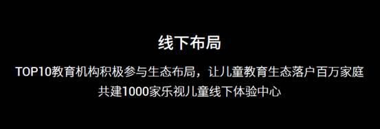 線下布局:聯合TOP10教育機構積極參與生態布局,讓兒童教育與生態落戶百萬家庭,共建1000家樂視兒童線下體驗中心。為讓更多的家庭享受大屏教育生態,樂視兒童將聯合行業前十的教育機構啟動百萬家庭補貼計劃,投入5億元反哺大屏教育生態。5月23日-7月10日,用戶在樂視商城購買樂視兒童教育套餐立享機構立減、折扣或贈課優惠。