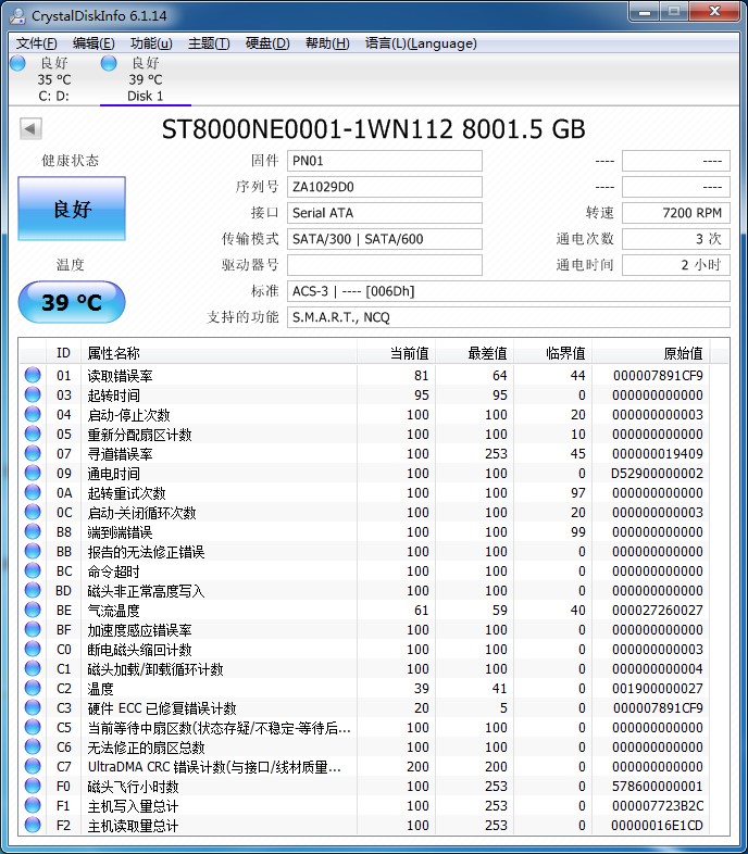 雖然是塊全新的硬盤,但抱著嚴謹的態度,我們用CrystalDiskInfo來看一下硬盤的SMART信息。
