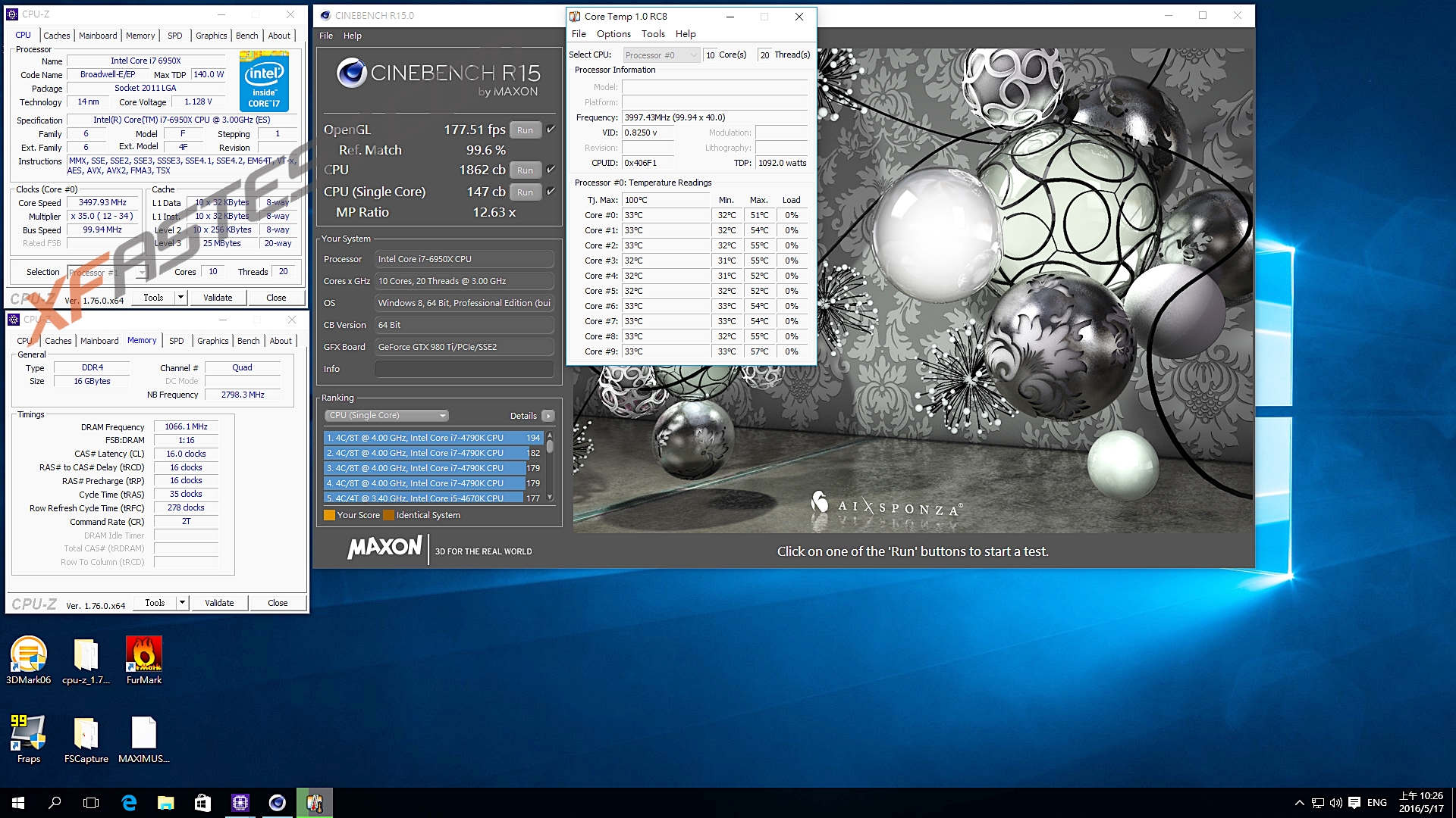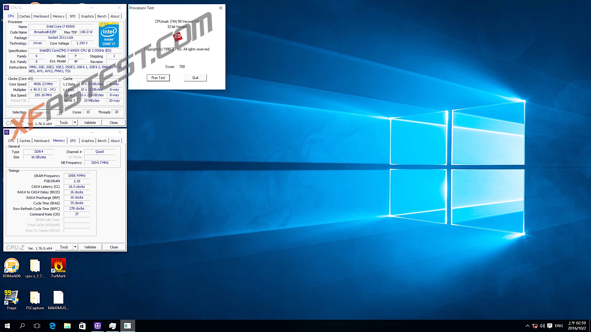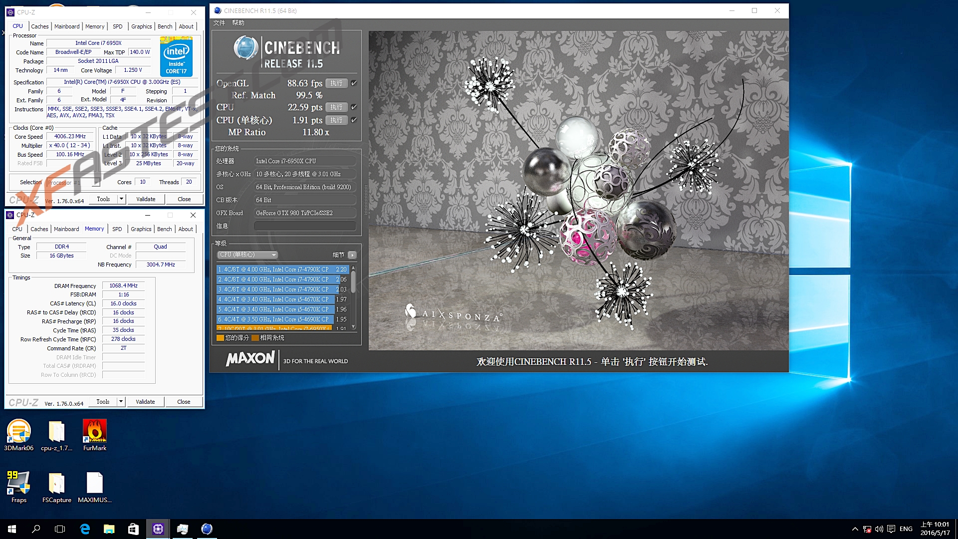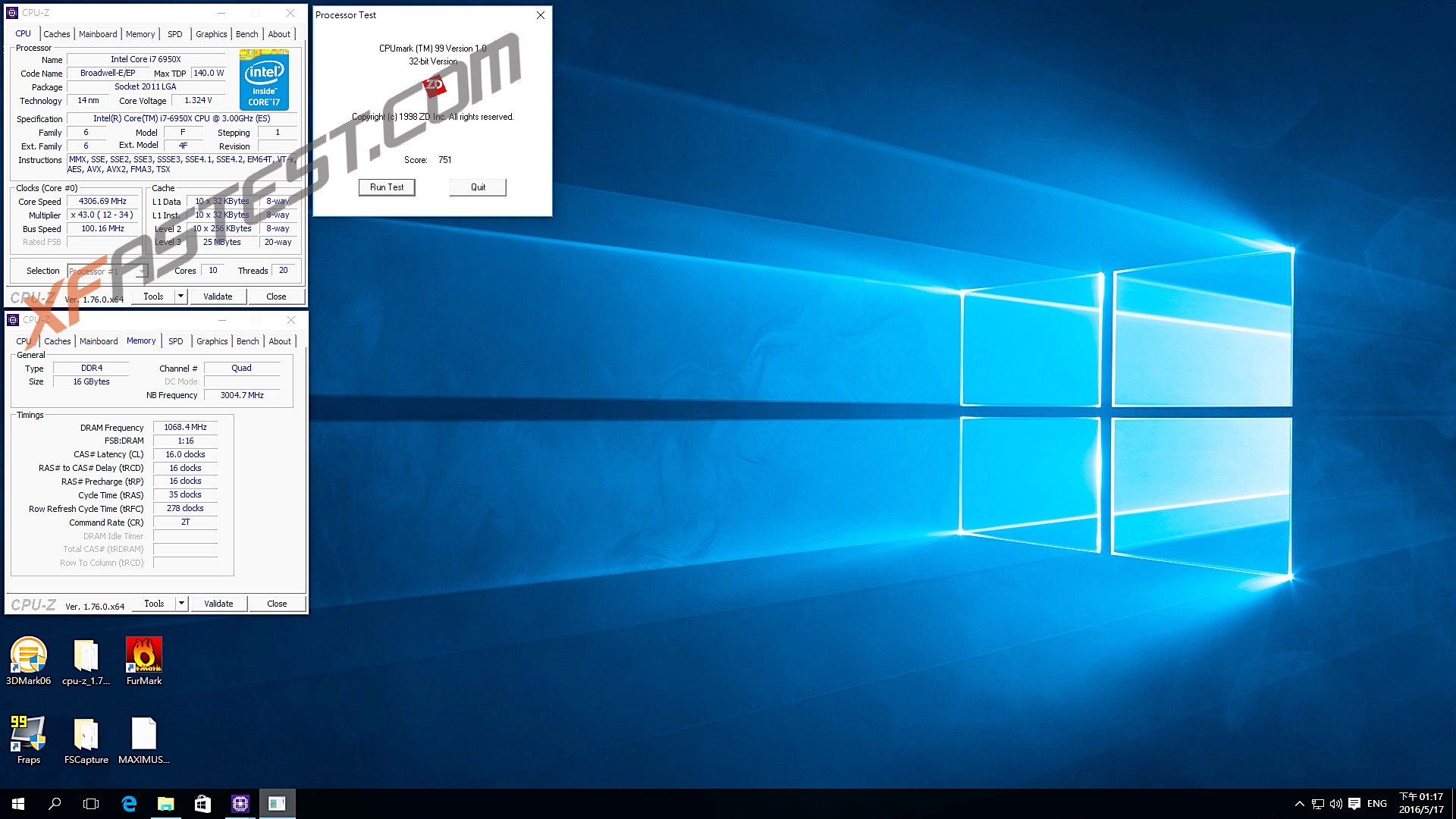 比較超頻前后,頻率相差0.5GHz的情況下,從CPUMark可以看到單核心效能成長11.8%,不過Skylake i7-6700K 4HZz的CPUMark為720,因此同頻率下i7-6950X的單核心效能是輸的,但相對的多核心i7-6700K就不是它對手,畢竟市場定位有點不同,至于CINBENCH R15多核心效能也有12%的成長,而3DMark Physics Score比較下也有12.6%的成長,個人覺得效能差異算是不錯,當然若是更前一代5960X相比那就贏更多了,只是i7-5960X的對手現在為i7-6900K才是。另外筆者測試使用的是Thermalright Silver Arrow IB-E Extreme空冷散熱器,可以看到上方的CINBENCH R15有附上CoreTemp溫度,3.5GHz落在55度上下,但超頻至4GHz后CINBENCH R15跑完最高溫度達75度,溫度相差約20度,因此想要玩超頻需要一顆不錯的空冷散熱器,且可以確定若要再往上超頻,除了CPU體質會有影響外,你的空冷將會成為關鍵之一。