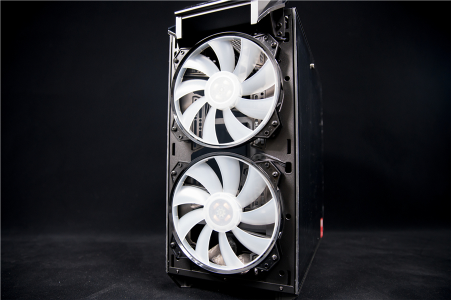H500M最為吸睛的一點(diǎn)就是正面的兩顆200mm ARGB風(fēng)扇。酷冷在燈光的調(diào)校上很有一手,當(dāng)這兩個(gè)大風(fēng)扇亮起來(lái)時(shí)并不會(huì)像其他友商競(jìng)品那樣亮到囂張而淺薄,正面籠箱式的兩側(cè)濾網(wǎng)設(shè)計(jì)使其看起來(lái)頗有層次感,內(nèi)斂也更具科技感。