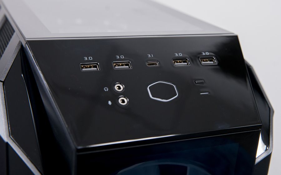 頂部I/O面板包括4個(gè)USB 3.0、一個(gè)USB 3.1 Gen 2 Type-C、3.5mm耳麥插孔和一個(gè)RGB燈效控制器按鍵,正面有USB 3.1接口,這實(shí)在是太太太令人開(kāi)心了。