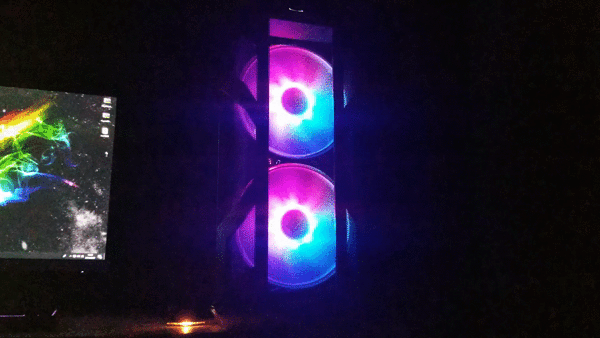 H500M自帶的兩把200mm ARGB風(fēng)扇光效可謂絢爛,冰神G120 RGB的冷頭光效也相當(dāng)令人滿意,與ROG主板的同步效果使得整體燈光在默認(rèn)狀態(tài)下有種“律動(dòng)感”。值得一提的是,ROG STRIX Z370-F GAMING主板自帶的RGB燈組相比之下就非常刺眼了,遠(yuǎn)不及酷冷光效的溫潤(rùn)。我們可以用兩張動(dòng)圖來(lái)感受一下: