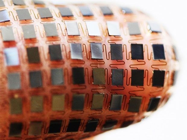今天,在美國國家科學(xué)院院刊發(fā)布的新研究里,Rogers描述了他們設(shè)計(jì)最近的樣子:把用可伸展的太陽能電池電路連接起來的許多纖薄的、毫米級的固態(tài)鋰離子電池構(gòu)成的數(shù)組放置在柔性基底上,然后折迭起來,這樣在最終的設(shè)備中太陽能電池板就能保證堆棧在電池之上。他用來演示這項(xiàng)新技術(shù)的設(shè)備是一個由熱敏組件和NFC無線模塊組成的可以測量和記錄溫度并且在必要時能將得到的數(shù)據(jù)傳送出去的設(shè)備,而電池組是它的一部分。Rogers的團(tuán)隊(duì)測試的志愿者在騎行和洗澡的時候測試了這個設(shè)備。這個纖薄柔韌的電池可以在不影響太陽能發(fā)電性能的情況下伸展30%之多,Rogers表示這意味著用戶在使用的時候會幾乎感覺不到它的存在。