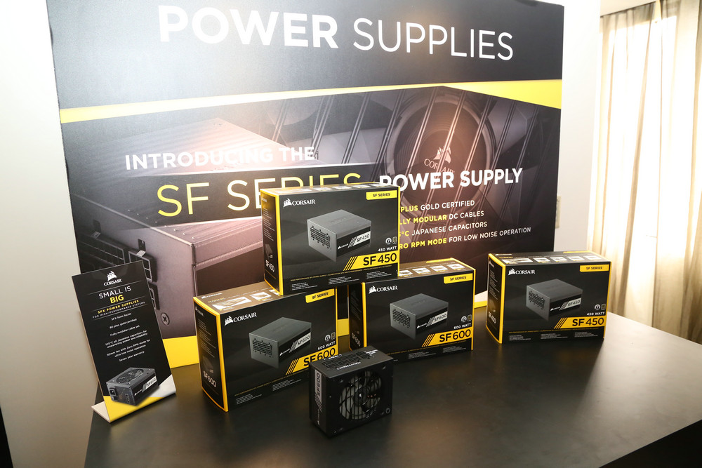 現場展出的海盜船SF450以及SF600電源,這兩款電源采用完全模塊化,高達80 PLUS金牌認證,并100%采用日系電容,SF系列帶來更小巧的身材提供更強、更穩定電力輸出,適合MINI ITX緊湊系統升級選擇。