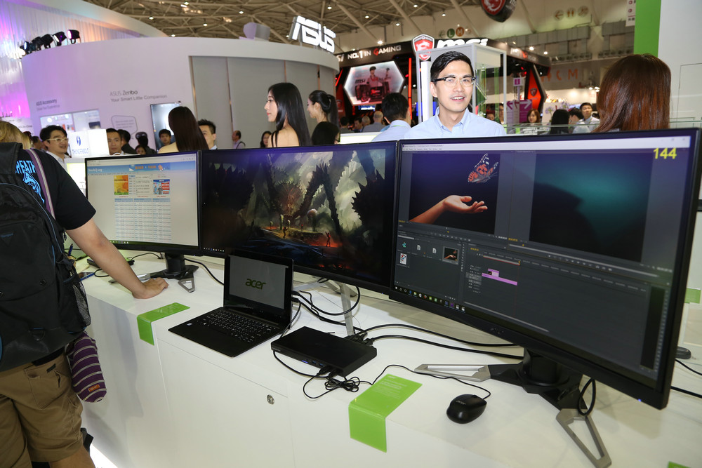 宏碁公司在COMPUTEX上展示了三款獲得2016年COMPUTEX最佳產品BestChoice獎項的產品,包括:AcerH7系列美型顯示器、曲面顯示器XR342CK,以及取自積木靈感的迷你PC-RevoBuild。27吋的AcerH277HU可支持USB3.1Type-C接口,用戶能輕易將顯示器與筆記本電腦、手機或其他智能裝置連接,在數據傳輸以及投射屏幕畫面時同步進行充電。H277HU具備優雅外型,從細節呈現出一流外觀與質感,無邊框設計、搭配經過鉆石切割機打磨邊緣的金屬刷紋底座,展現卓越設計與出眾質量;并配備WQHD(2560x1440)分辨率的IPS屏幕、內建DTS?Sound與AcerTrueHarmony音訊技術,可增強低音并降低失真,H277HU是享受畫質出色、臨場感十足的高分辨率電影的顯示器首選。