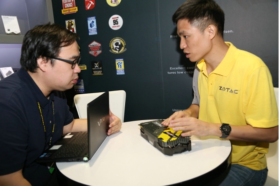 在今年的COMPUTEX上,索泰重點展出了便攜式的VR背包,定制化的miniPC,采用臺式機的CPU以及臺式機的EN980 GPU做成MxM的規格,目前續航時間2小時左右,能享受到更自由的VR。同時全新的PCI-E SSD以及非公版GTX 1080也亮相,特別的背部發光設計很有創意。在展會期間我們也有幸專訪了索泰市場部產品經理鄧偉雄先生,就索泰的未來發展方向以及全新產品的設計理念做了溝通。