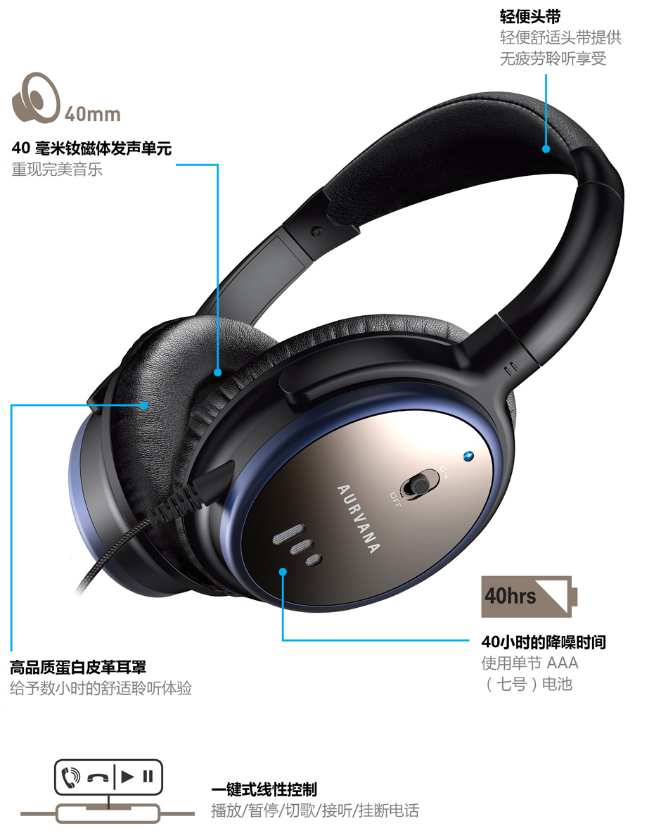 這款AURVANA ANC主動降噪耳機采用專業(yè)調校的 40 毫米釹磁體發(fā)聲單元耳機,頻率響為20Hz ~ 20kHz,而在主動降噪功能開啟時阻抗為290歐姆,官方稱這款AURVANA ANC耳機的主動降噪效果可達到87%,當 ANC 功能開啟時,耳機內的 AAA 堿性電池可支持長達 40 小時的連續(xù)播放。當電量用盡時,您的音樂同樣能正常播放。
