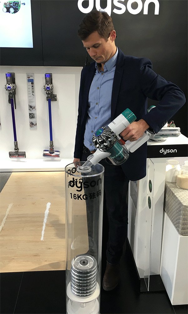 容器中的砝碼重16KG,也就是32斤,大約是32瓶500毫升塑料瓶裝可樂的重量,戴森V6 Mattress毫不費力就把砝碼吸了上來,然而這還不是V6 Mattress的極限,工作人員介紹其最大吸約為20KG,足可見其吸力強勁。