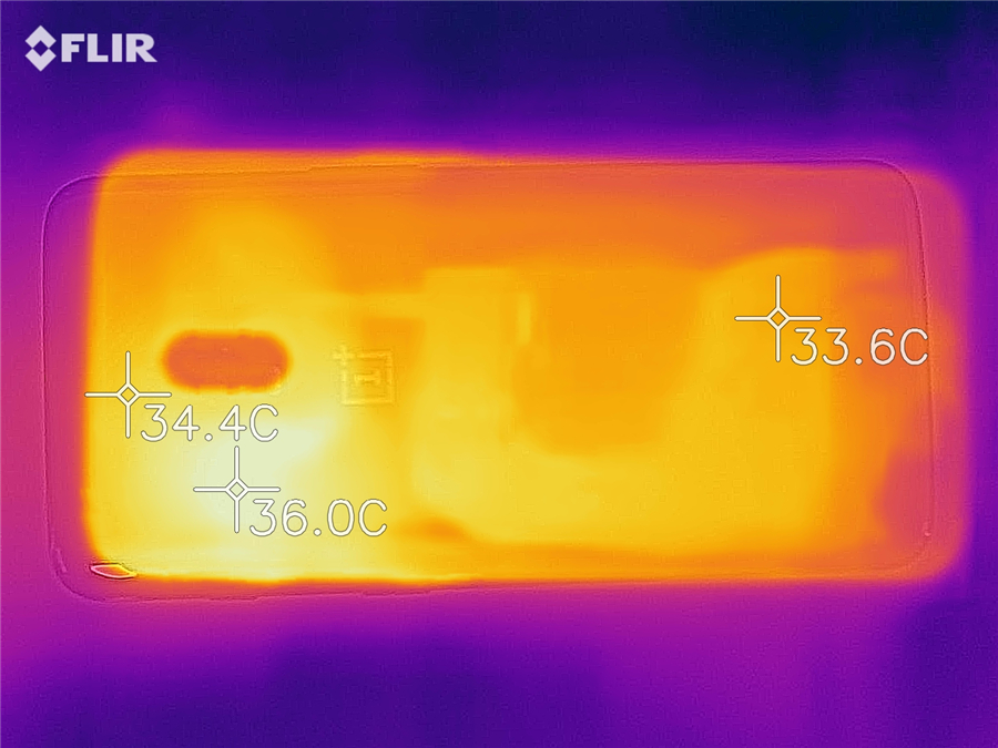 一加6T邁凱倫定制版的散熱也表現優秀。在《王者榮耀》游戲30分鐘后,只在左手感到有些溫熱,在溫度槍下顯示其最高溫度為36℃,集中在機身上半部分。