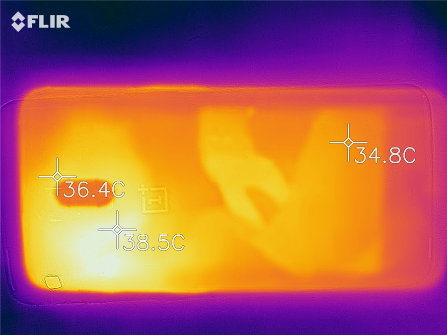 而在《絕地求生:刺激戰場》游戲30分鐘后,左手在握持的中框處能夠感受到輕微的發燙,但也在可接受范圍內,此時機身上半部最熱處達到38.5℃。