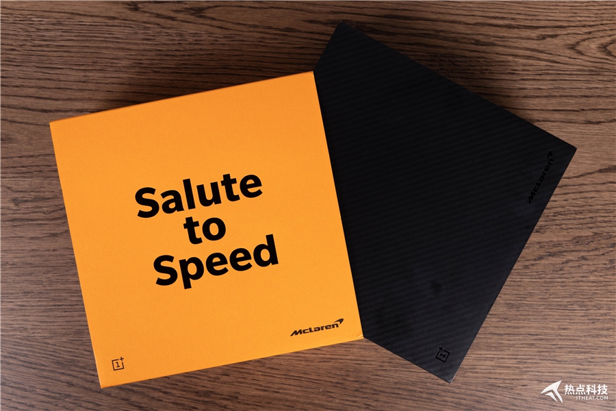 比起手機上的低調雅騷,包裝盒則奔放了許多,邁凱倫的味兒也更濃。整體的顏色基調為橙+黑,材質紋理上模仿的是車用皮革+碳纖維,顯然元素與邁凱倫跑車一脈相承。外封上是大大的橙底黑字“Salute to Speed”,向速度致敬。