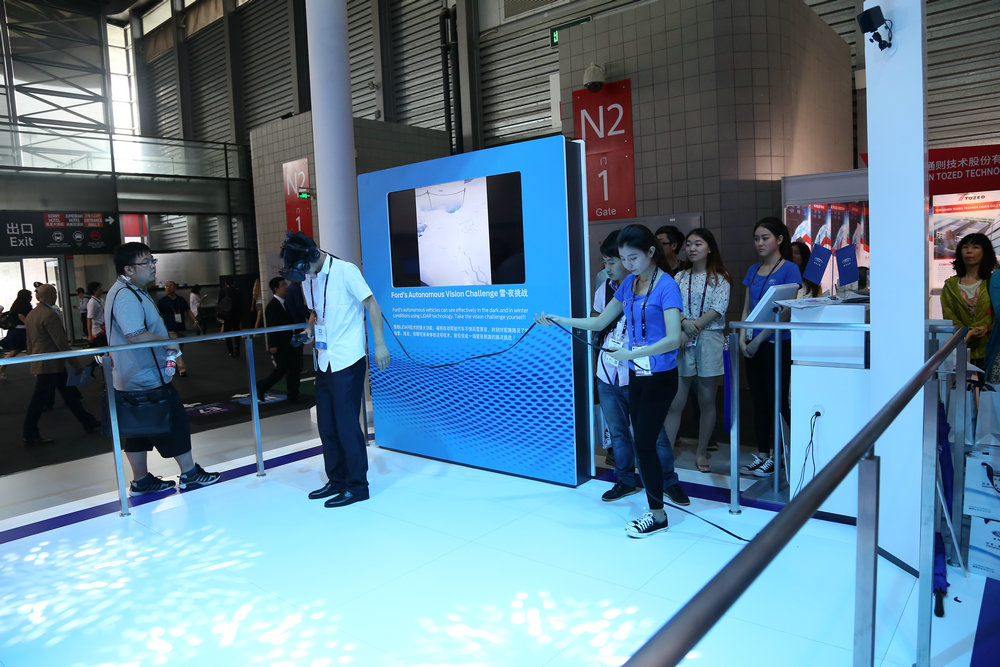 在展位的一角,福特結合VR開發了一個小游戲,讓用戶通過游戲的方式直觀的體驗到福特的新技術