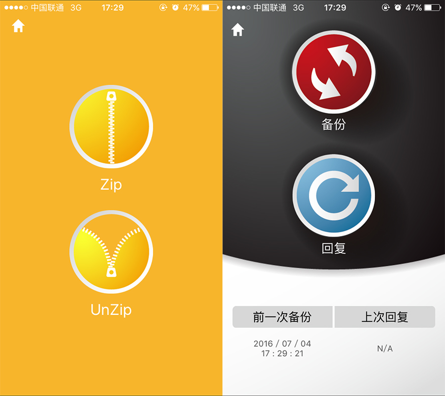 App擁有的壓縮和解壓縮的功能也非常的方便,只要輕松一點便可以輕松操作。同樣方便的還有備份功能,Tumblr、Facebook相冊、通訊錄和日歷都可以進行備份與恢復(查閱英文版本為“Restore”小編覺得應譯為“恢復”而非“回復”),遺憾的是這兩款社交應用在中國大陸地區并不可用。