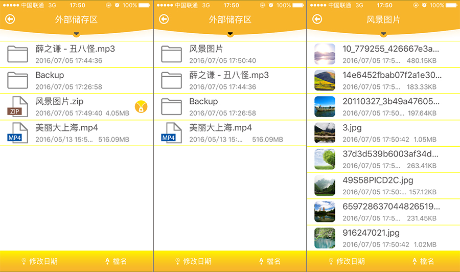 程序內可以清楚的看見內部存儲和外部存儲的使用量,三個頁面也充分的展現了這款App豐富的功能性。