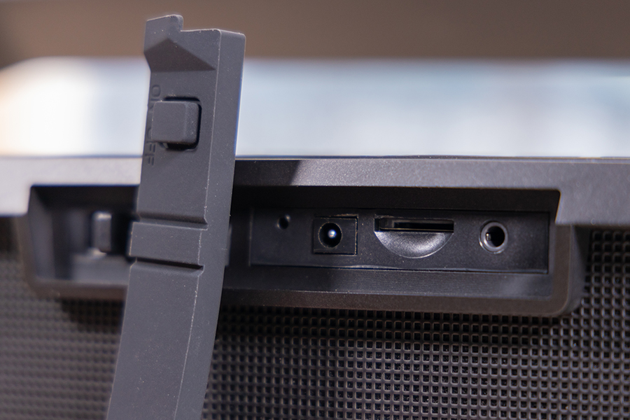 打開硅膠蓋后,便可看到右側區域分別有LED指示燈,DC充電口,micro-SD卡槽以及3.5mmAUX插座。如用戶將帶有MP3或wma等音頻格式文件的micro-SD存儲卡插入卡槽后,音箱即可播放存儲卡中的音樂。