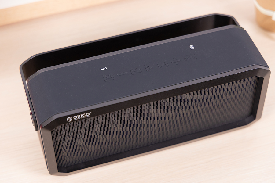 音箱有個手提式的把手,可向前或向后彎折90度角,而音箱大部分功能按鍵都布局在了音箱本體的頂部,音量加減和快進后退鍵略表不提,M鍵為模式切換按鍵,在M鍵的上方有個NFC連接的標志,最中間的播放鍵除了播放功能外,還具有暫停和通話功能,最右側的BASS按鍵為重低音功能,顯然這款藍牙音箱在播放搖滾樂等音樂時切換到該功能下可以獲得更好的收聽效果。