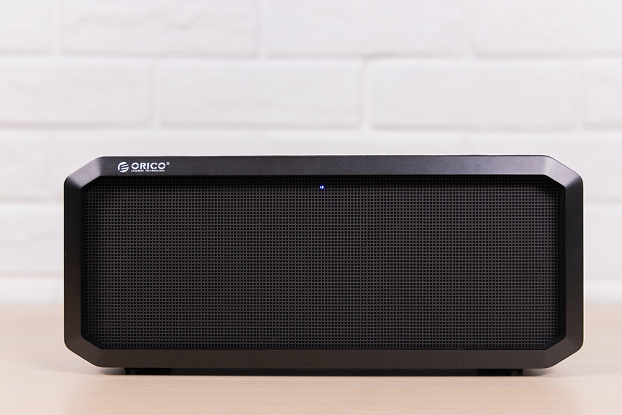 打開包裝后我們便看到了這款藍牙音箱的本來面貌,音箱采用了鋁合金材質,不容易沾染指紋,正面除了蜂窩狀揚聲器和左上角的奧睿科logo之外就再無任何顯眼的標記和按鈕,十分簡潔。