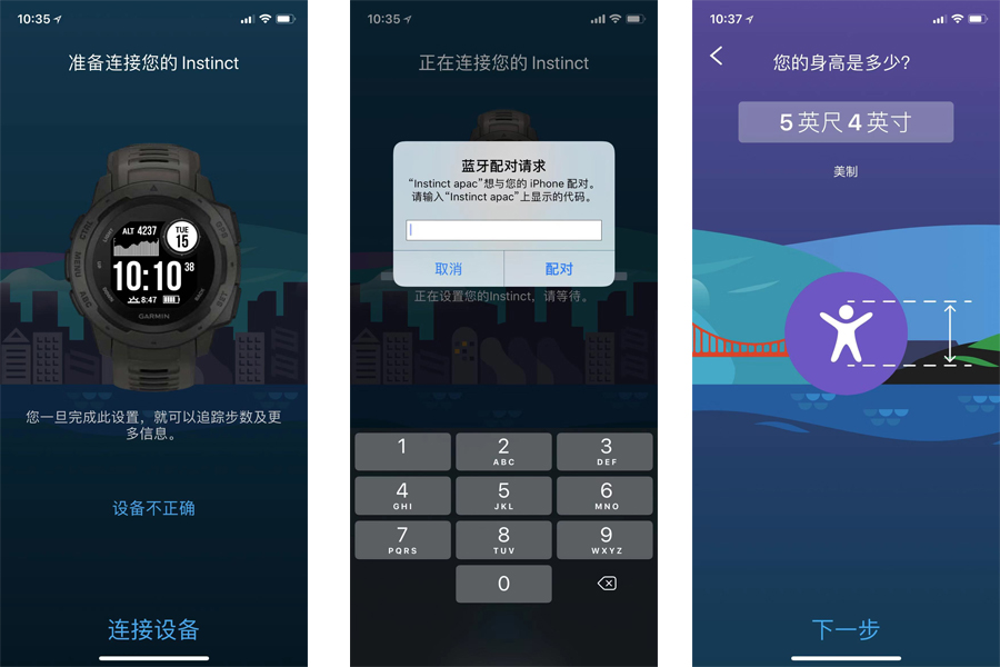 開機(jī)使用不復(fù)雜,但首先要下載與之配對的App,因?yàn)樵陂_機(jī)后Instinct會提示你與手機(jī)進(jìn)行配對。識別連接的過程很快,在進(jìn)行一系列出生日期、體重等私人化的數(shù)據(jù)設(shè)定后,來到了App主界面。