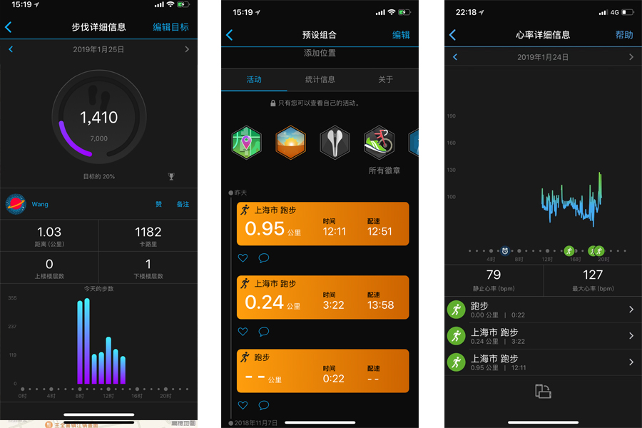 另外就是Garmin的拿手好戲GPS定位,為了測試這個(gè)功能,我選擇了輕量級用戶常會使用的跑步模式。因?yàn)橄ドw有傷,太過激烈的運(yùn)動無法達(dá)成,只能用簡單的短途跑步數(shù)據(jù)來進(jìn)行參考。短按右上角GPS鍵就可調(diào)出跑步模式,在啟動的同時(shí),手表開始為跑動服務(wù)。在完成運(yùn)動選擇保存后,就可以通過App查看具體參數(shù),包括地圖、距離、配速、時(shí)間、卡路里等常規(guī)顯示。