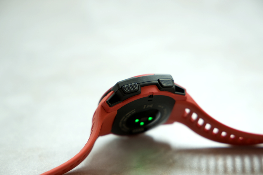 翻轉(zhuǎn)機(jī)身,可以看到凸起的心率傳感器,右側(cè)是充電/數(shù)據(jù)傳輸接口,佳明沒有選擇給裸露的充電口配上防塵蓋,應(yīng)付日常使用沒什么問題,但難以預(yù)估惡劣環(huán)境下使用Instinct會不會對充電有影響。