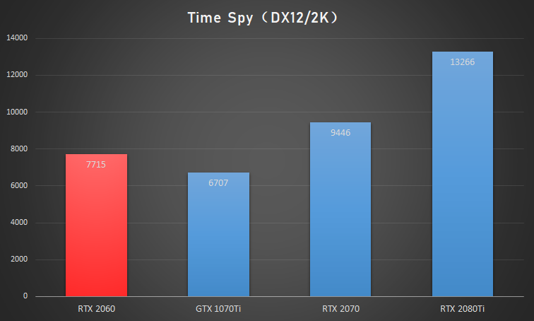 大概是因?yàn)镈X12更加新一點(diǎn)的緣故,針對(duì)該環(huán)境進(jìn)行測(cè)試的Time Spy渲染輸出分辨率起步便是2K,這其實(shí)也代表了新一階段顯示器分辨率的發(fā)展趨勢(shì)。RTX 2060在Time Spy項(xiàng)目中的得分為7715,比GTX 1070Ti還高了約1000分,為RTX 2080Ti的58%。