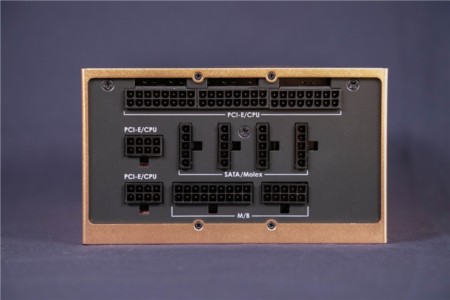 作為一塊通過了80Plus金牌認證的全模組電源,安鈦克HCG X1000的身份甚至能從外觀上一眼看出——傳統電源類產品或通體裸露的金屬色,或整個都是黑的,而安鈦克HCG X1000卻是以金色為主色調,一體鋁合金外殼的顏色準確說來還是浪漫曖昧的玫瑰金。方正的造型和金黑相間的配色讓它看起來科技氣息被沖淡了許多。