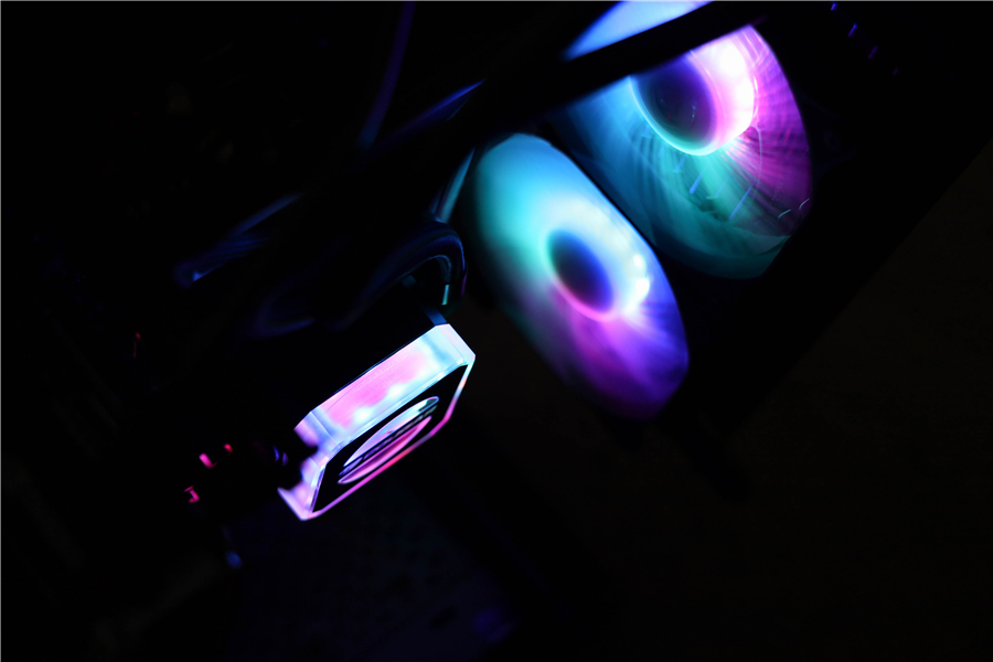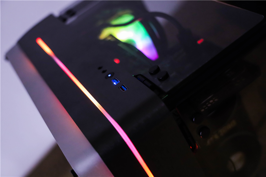 整機的燈光效果也非常驚艷。機箱、主板、散熱、顯卡、內存等各個部件的RGB通過控制盒連接成了一個整體,通過遙控器就能切換個性化場景。