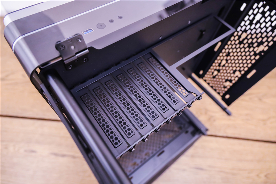 主硬件倉的布局相當獨特,是一般機箱安裝方向右轉90度。這能夠讓顯卡豎直向下安放,風扇直對正面。