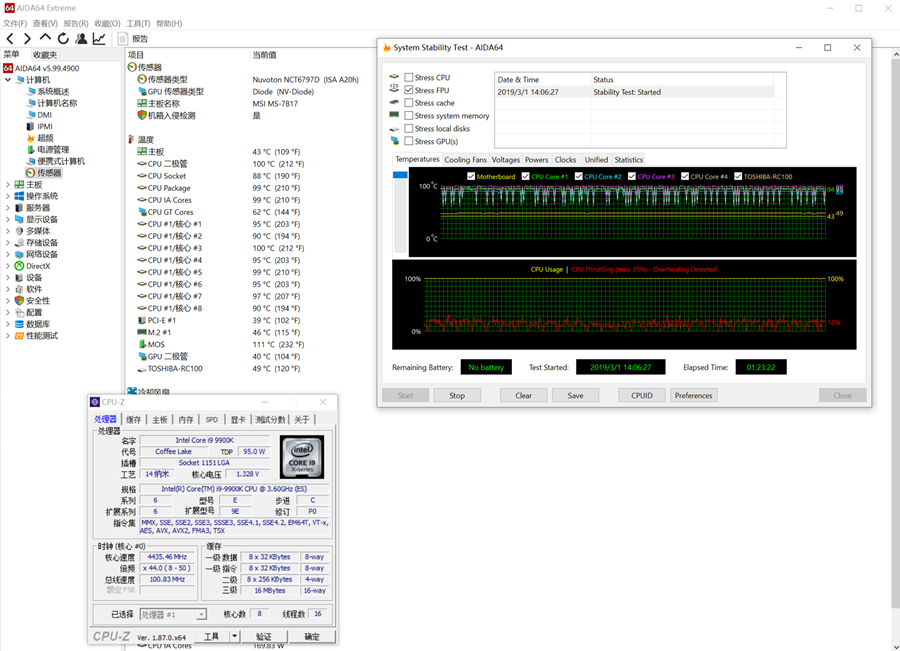對于散熱器來說,壓制CPU溫度的任務向來放在首位。我們在BIOS中將風扇轉速設置為自動,使用AIDA64壓力測試單烤FPU一小時以上,此時CPU能夠保證全核4.6GHz頻率,核心平均溫度為95攝氏度。以240尺寸的冷排規格能夠壓制i9-9900K,Helor 240的散熱表現很不錯。
