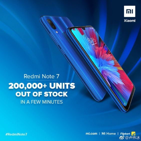 根據(jù)小米副總裁盧偉冰公布的數(shù)據(jù)顯示,Redmi Note 7印度首銷,幾分鐘內(nèi)20多萬臺(tái)售罄。