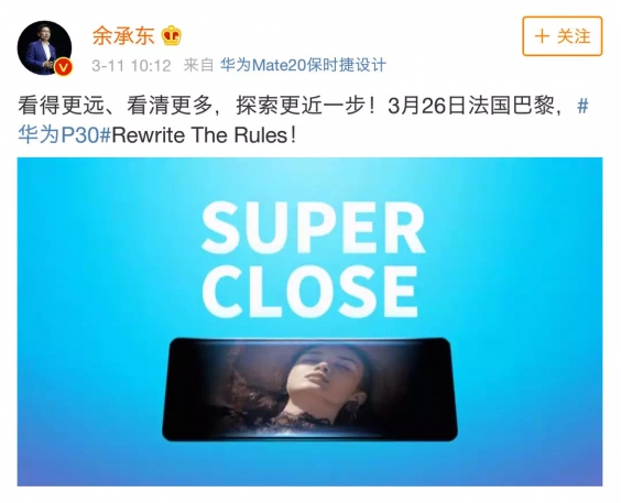 昨天上午10點12分余承東發布微博:“看得更遠,看清更多,探索更近一步!3月26日法國巴黎,#華為P30#Rewrite The Rules!”并配有一張動態圖片。