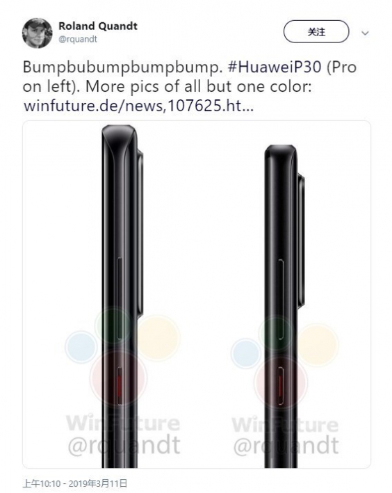 不過根據知名爆料人Roland Quandt在推特上放出的華為P30 Pro和P30的側面照(左側為P30 Pro),可以清楚地看到,華為P30 Pro采用了前后雙曲面的設計,而華為P30 Pro攝像頭所占的面積也大于P30。